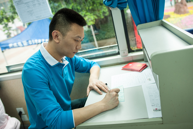 邓志刚,35岁,采血车驾驶员。